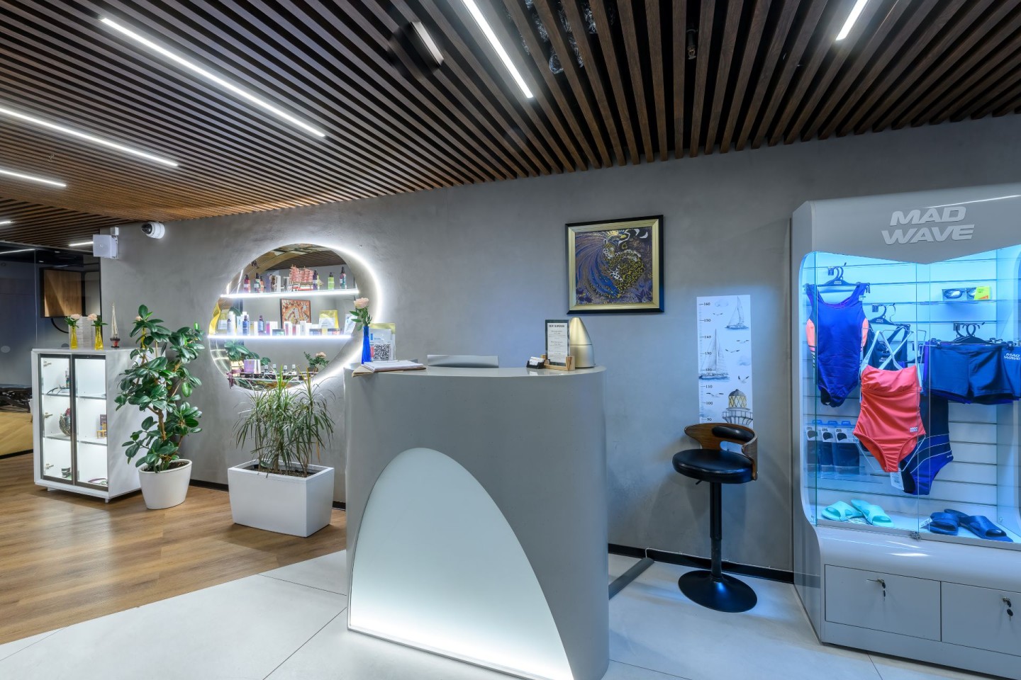 Кроме того, у нас вы найдете витрину с разнообразной косметикой и купальными принадлежностями. Мы поможем подобрать для вас средства по уходу за лицом и телом.