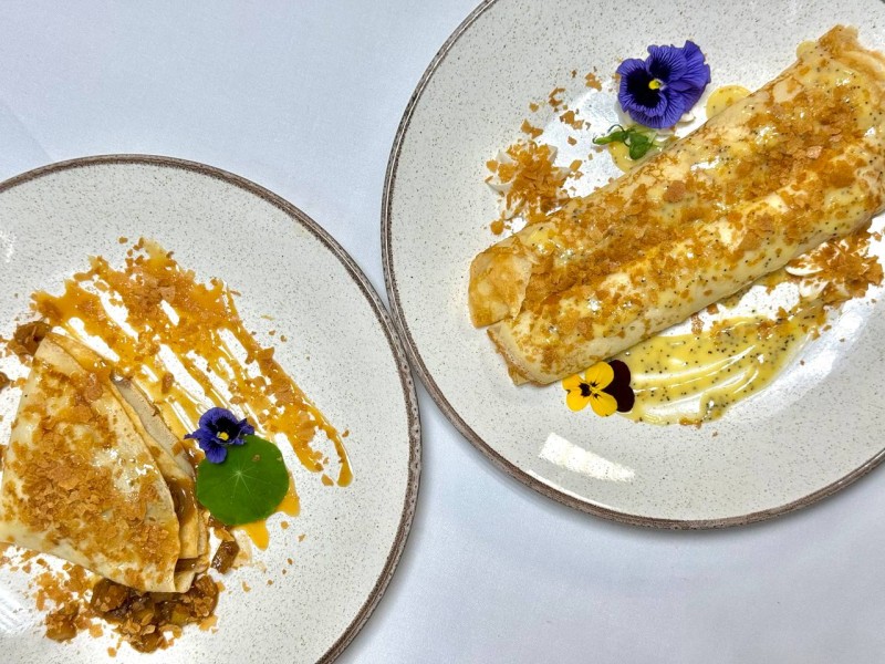 В ресторане Дунай масленичное меню раскрывается в современной интерпретации: классические блины, разнообразные начинки и продуманная подача от шеф-повара Дениса Кондакова.