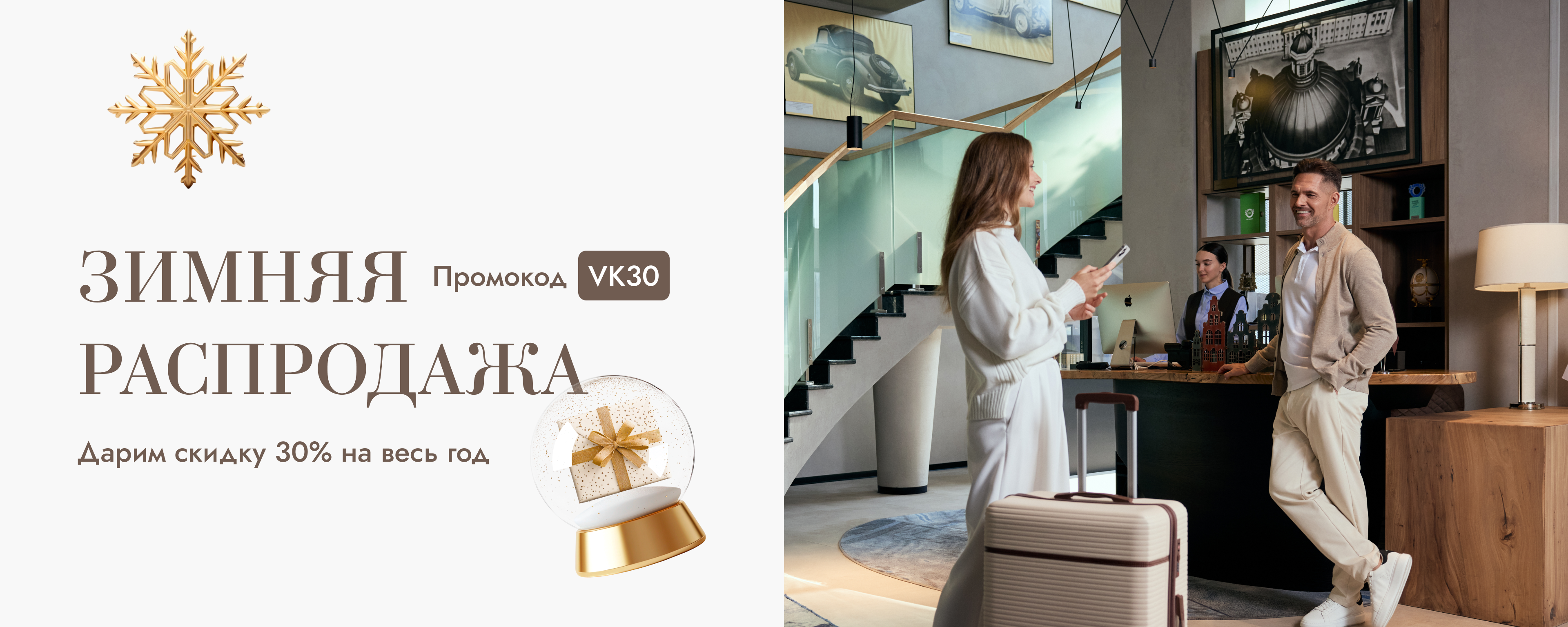 Зима — лучшее время, чтобы спланировать свои поездки на весь 2026 год с максимальной выгодой и без спешки. По нашей Зимней распродаже дарим скидку 30% на проживание — успевайте забронировать отпуск, деловую командировку или романтический уикенд по самой приятной цене!